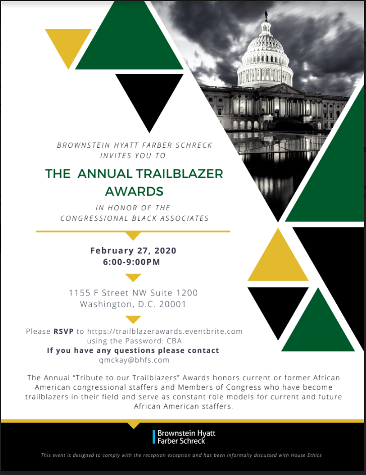 The Congressional Black Associates is proud to announce our signature Trailblazer Awards, where we honor distinguished Members and Staff on the Hill. The tentative date for the ceremony will be Thursday, February 27, 2020.